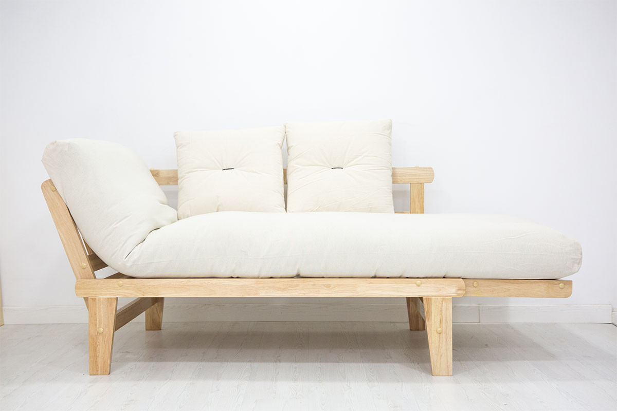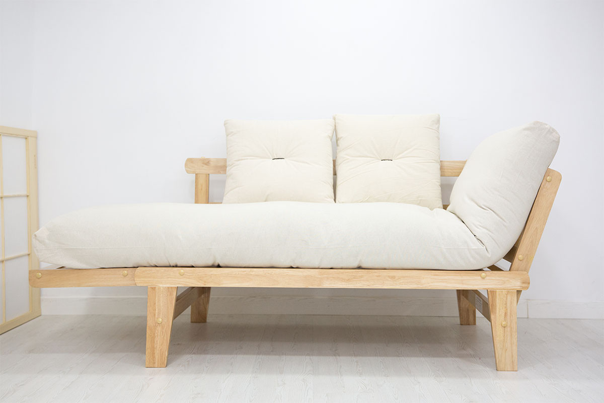 Disponible en acabados natural. El sofá-cama Sésamo mide 80x1563 cm. Sin embargo, una vez transformado en cama, sus medidas pasan a ser 82x153 cm.